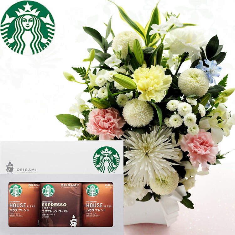 【あす楽】お供え花とコーヒーのセット旬のおまかせお供えアレンジメントSサイズとスターバックスコーヒギフトセット アレンジメント メッセージカード お盆 お彼岸 お供え FKAA