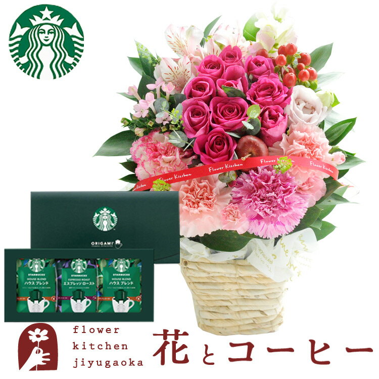 花とコーヒーのセットローズガーデンアレンジとスターバックスコーヒギフトセット 送料無料 北海道・九州・沖縄お届け不可生花 花束 メッセージカード生花 花 プレゼント 贈り物誕生日 記念日 お祝い 送別 FKAA