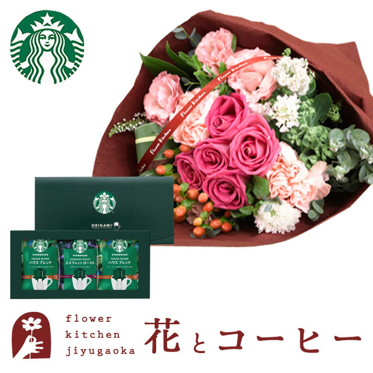 花とコーヒーのセットバラブーケとスターバックスコーヒギフトセット 送料無料 北海道・九州・沖縄お届け不可生花 花束 メッセージカード生花 花 プレゼント 贈り物誕生日 記念日 お祝い 送別 FKAA