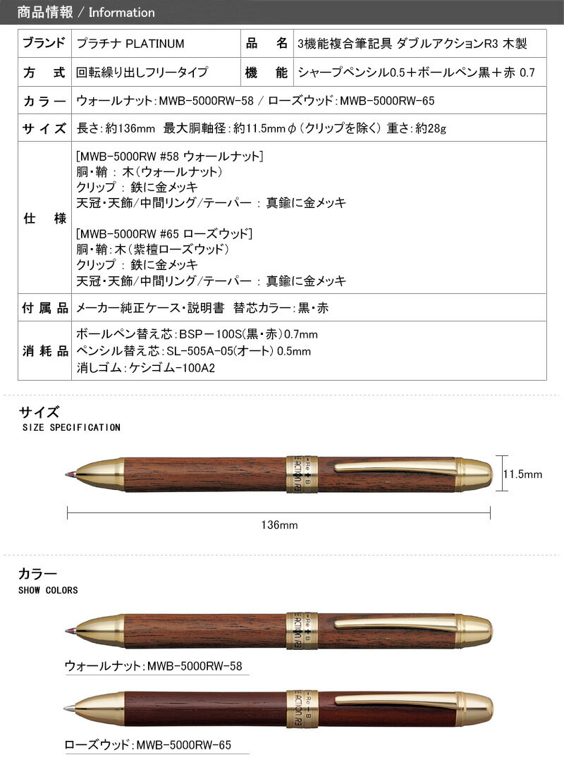 【ブランド】 プラチナ PLATINUM 【品 名】 3機能複合筆記具 ダブルアクションR3 木製 【方 式】 回転繰り出しフリータイプ 【機 能】 シャープペンシル0.5mm+ボールペン黒+赤 0.7mm 【カ ラ ー】 ウォールナット:MWB-5000RW-58 ローズウッド:MWB-5000RW-65 【仕 様】 [MWB-5000RW #58 ウォールナット] 胴・鞘 : 木(ウォールナット) クリップ : 鉄に金メッキ 天冠・天飾/中間リング/テーパー : 真鍮に金メッキ [MWB-5000RW #65 ローズウッド] 胴・鞘:木(紫檀ローズウッド) クリップ : 鉄に金メッキ 天冠・天飾/中間リング/テーパー : 真鍮に金メッキ 【サ イ ズ】 長さ:約136mm 最大胴軸径:約11.5mmφ(クリップを除く) 重さ:約28g 【付 属 品】 メーカー純正ケース・説明書 替芯カラー:黒・赤 替芯サイズ(BP0.7+SP0.5) 【消 耗 品】 ボールペン替え芯:BSP−100S(黒・赤)0.7mm ペンシル替え芯:SL-505A-05(オート) 0.5mm 消しゴム:ケシゴム-100A2 【商品説明】 黒檀・紫檀 主に東南アジアの熱帯・亜熱帯域等に生育する高級な木材です。