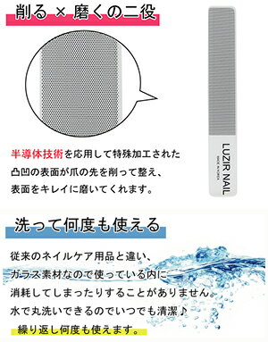 『磨く』と『削る』の二役!清潔半導体技術を応用して特殊加工された凸凹の表面が爪の先を削って整え、表面をキレイに磨いてくれます。